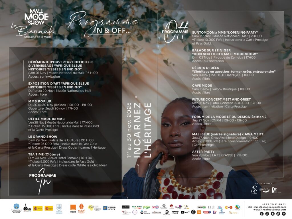 Sous le haut patronage de M. Mamou Daffé, Ministre de l’Artisanat, de la Culture, de l’Industrie Hôtelière et du Tourisme, et en collaboration avec l’Ambassade du Royaume d’Espagne, se tiendra la cérémonie d’ouverture officielle du Mali Mode Show 2025, suivie du vernissage de l’exposition « Afrique Bleue, Histoires tissées en indigo ».
